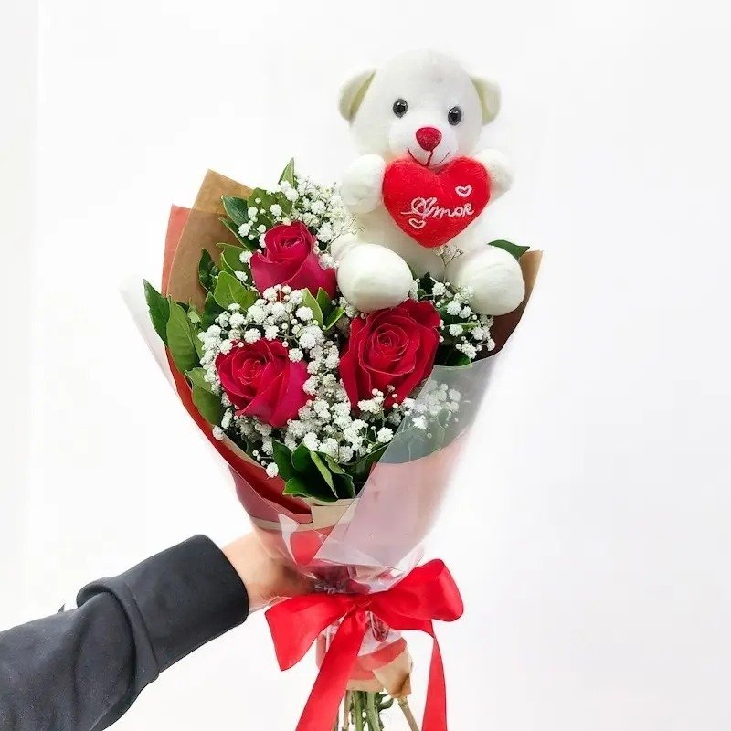 Buquê Amor - 3 Rosas Vermelhas e Ursinho