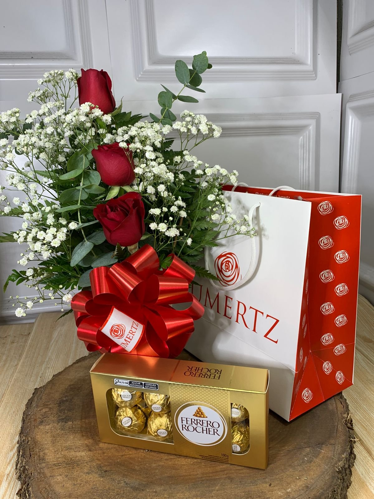 Kit Sacola - Arranjo 3 Rosas Vermelhas e Ferrero Rocher 8 Unidades
