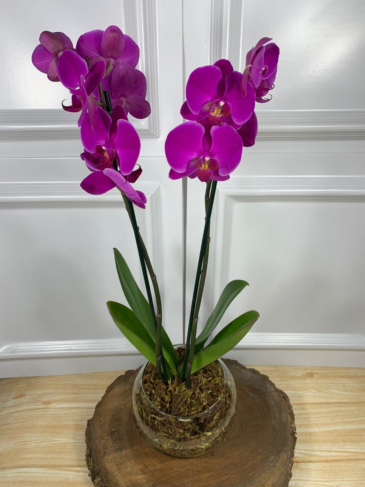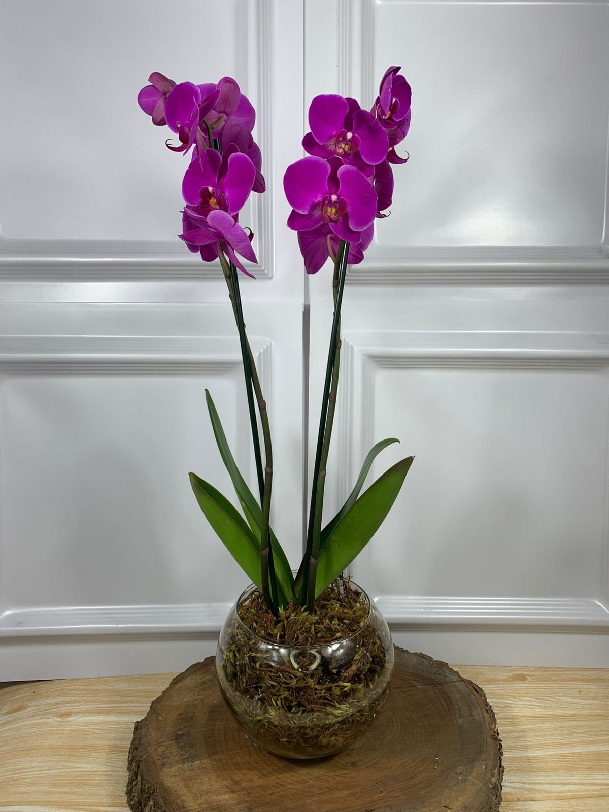Orquídea Phalaenopsis em vaso de vidro com cascas de pinus: a opção para quem procura elegância.